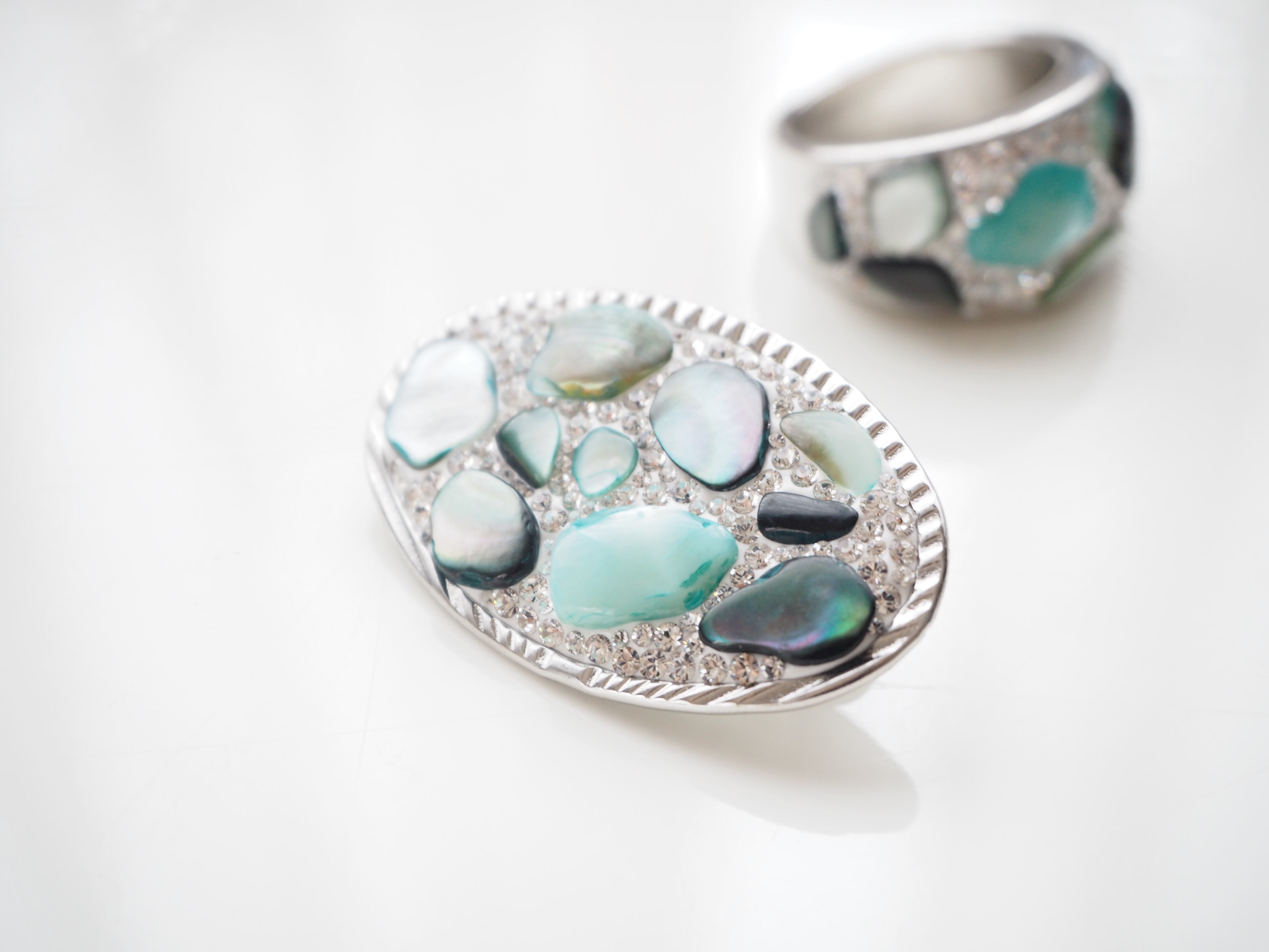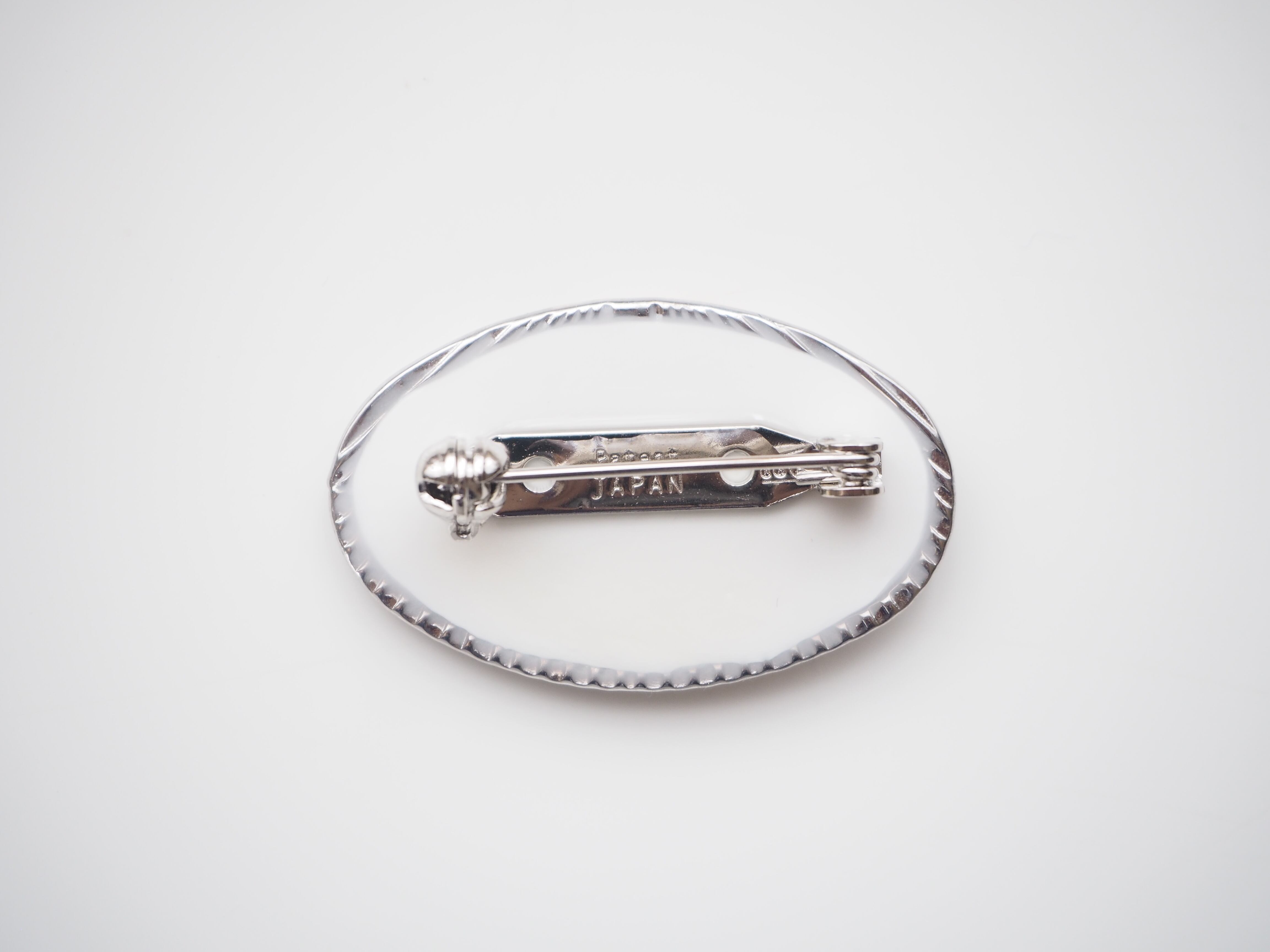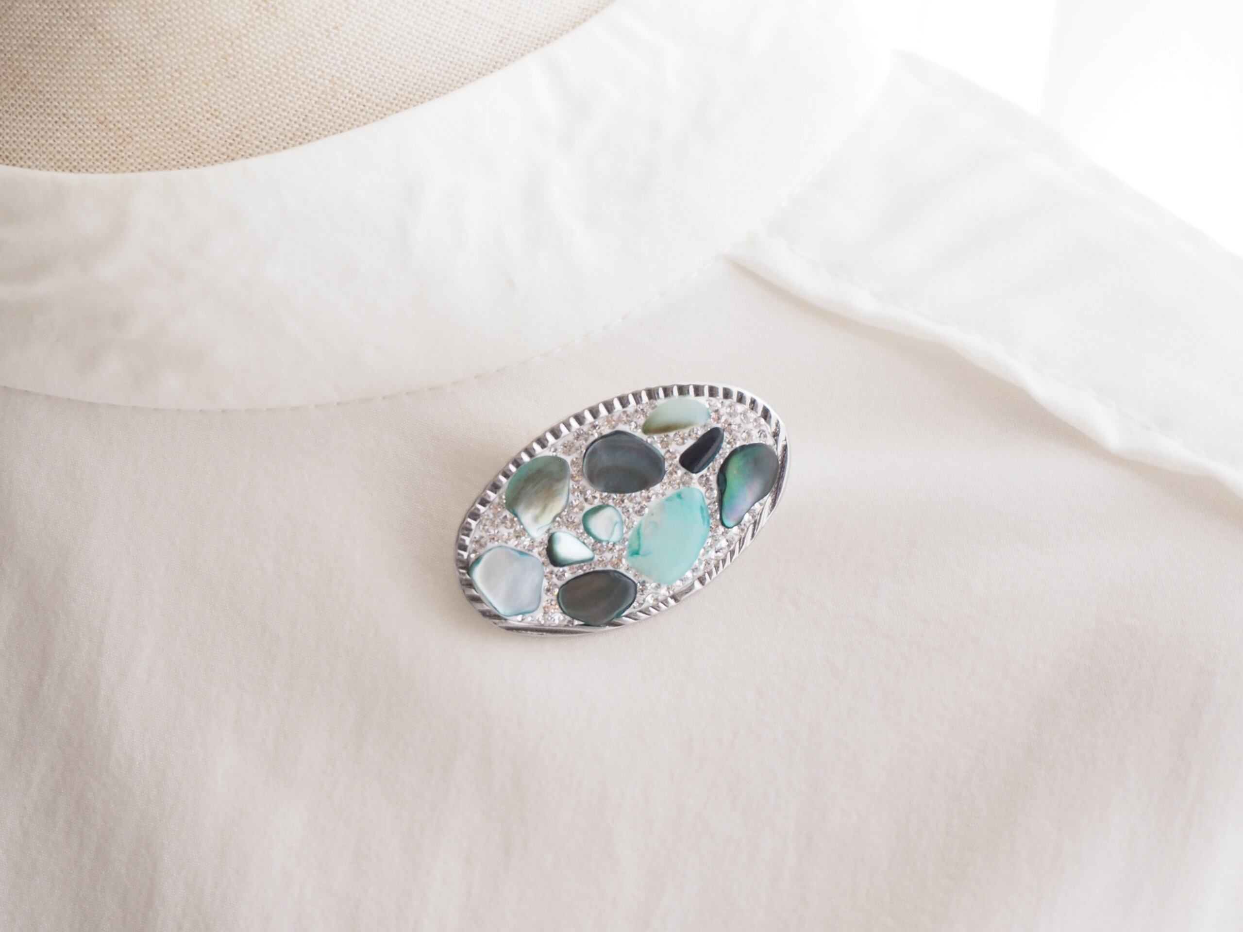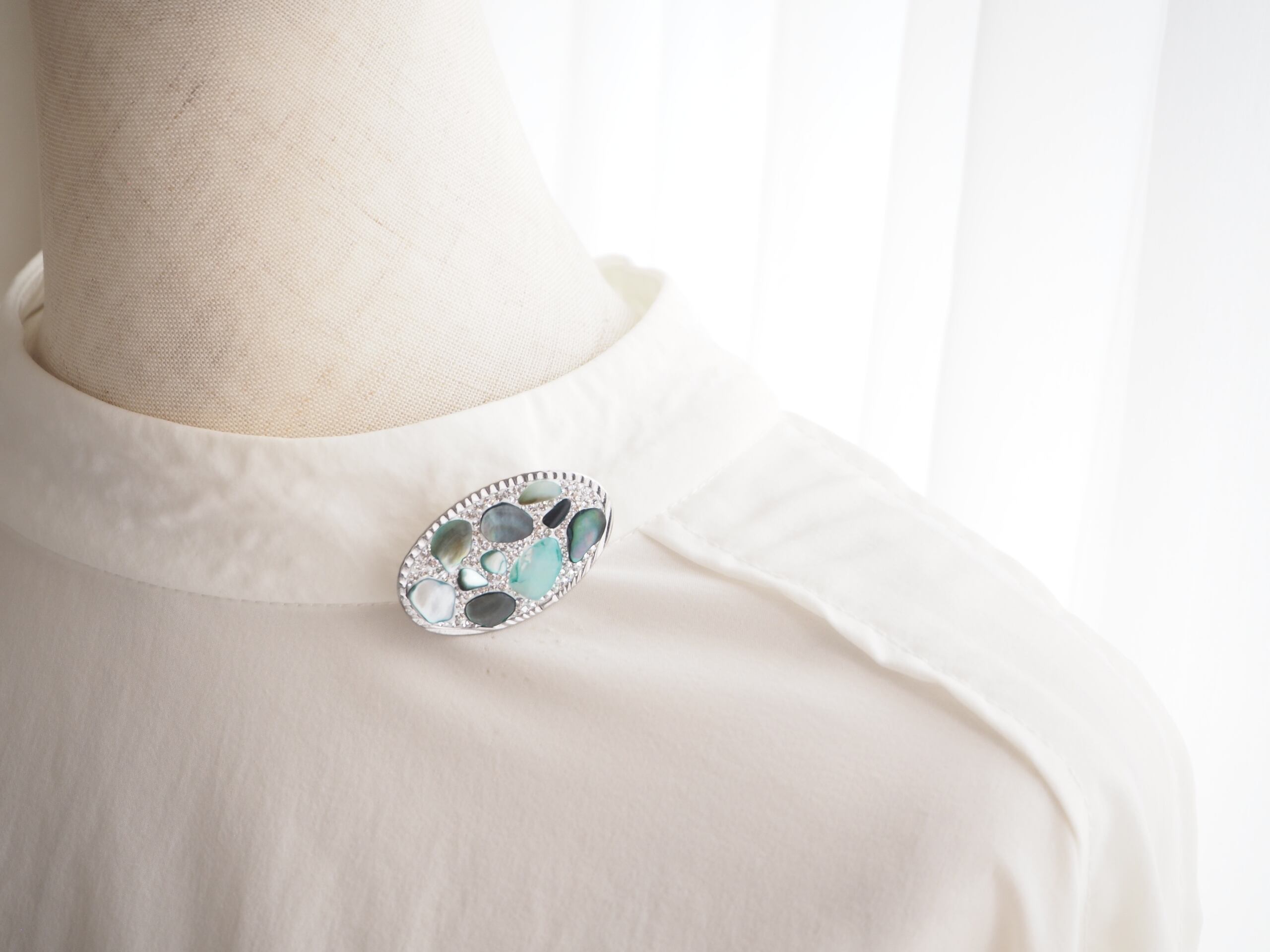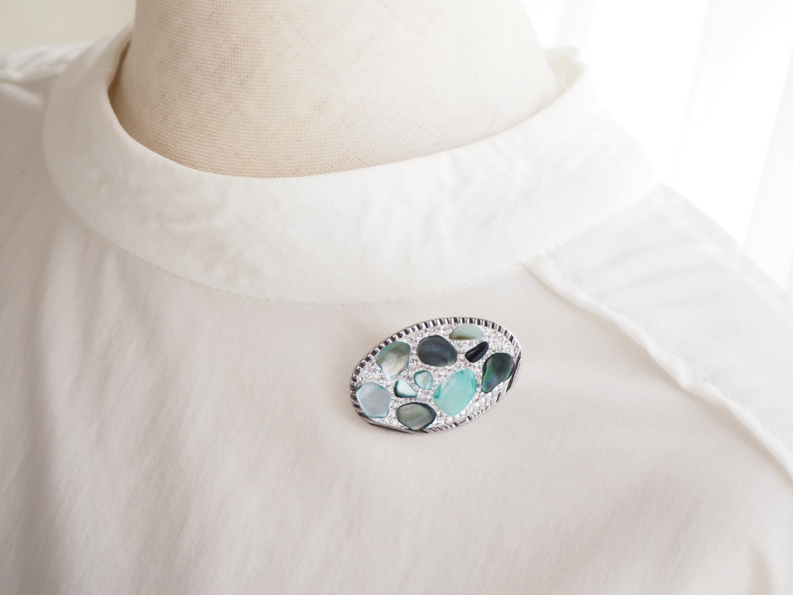 自然素材のシェルと極小のスワロフスキー®クリスタルを散りばめたオーバル型のブローチです。