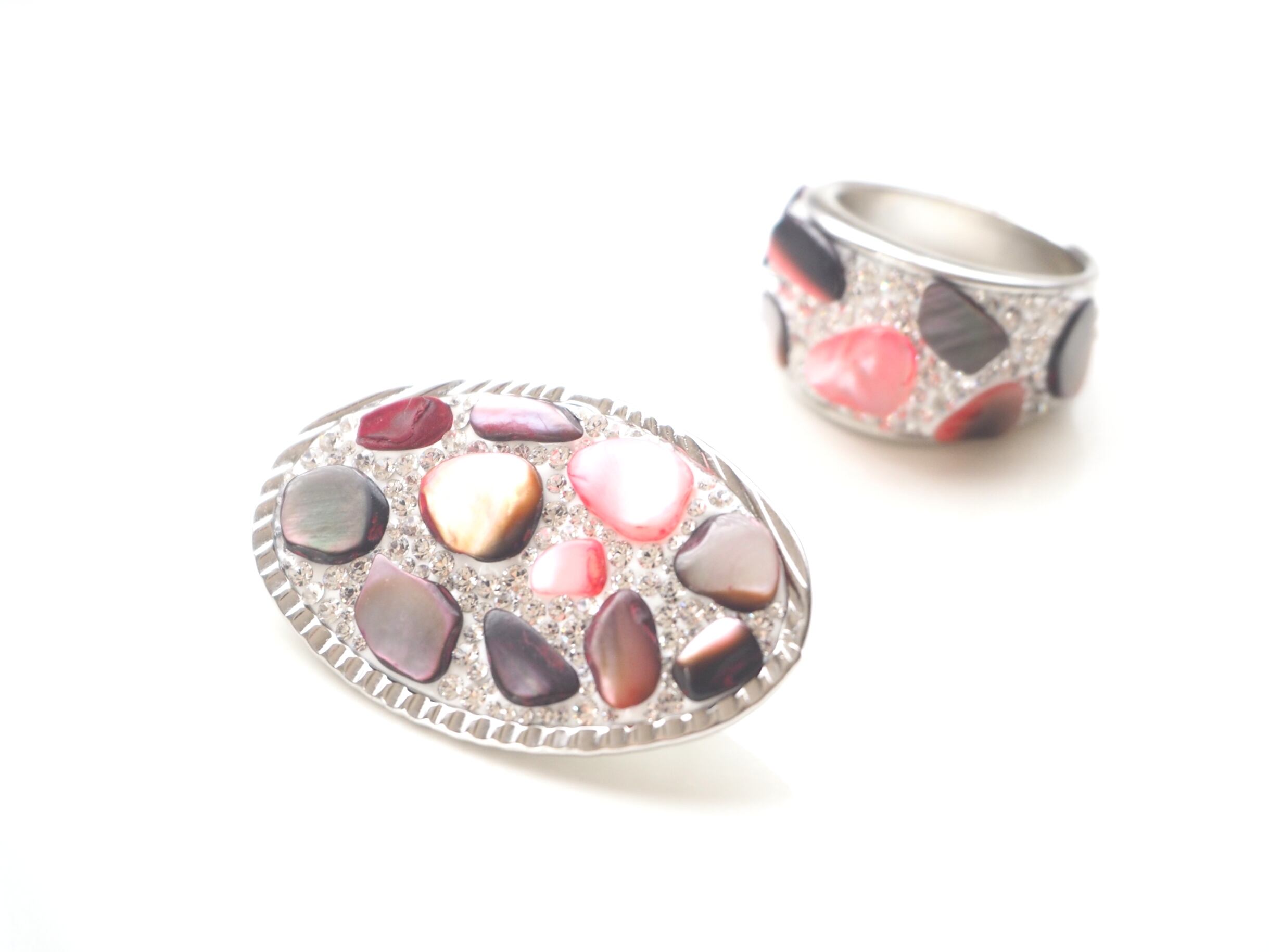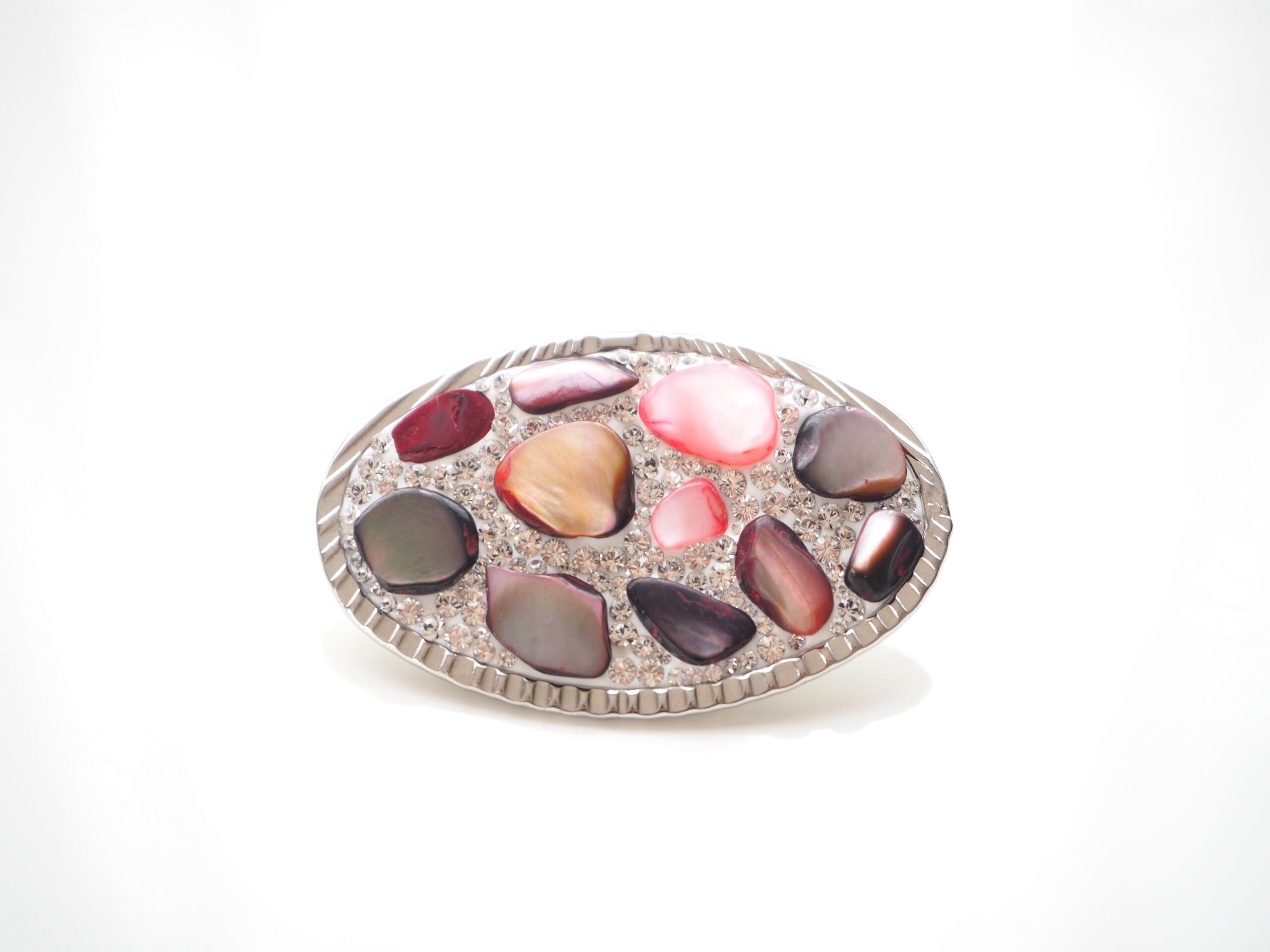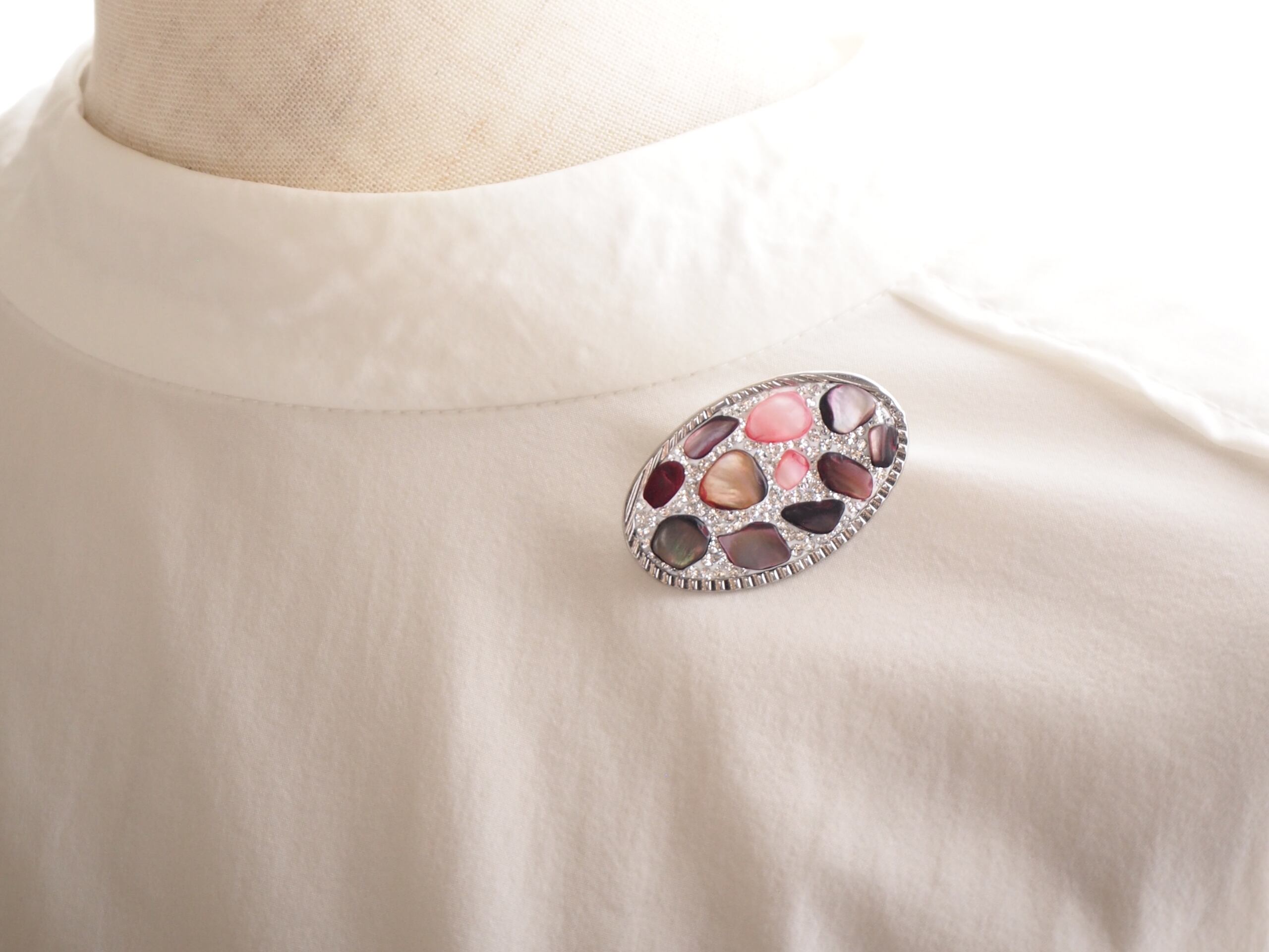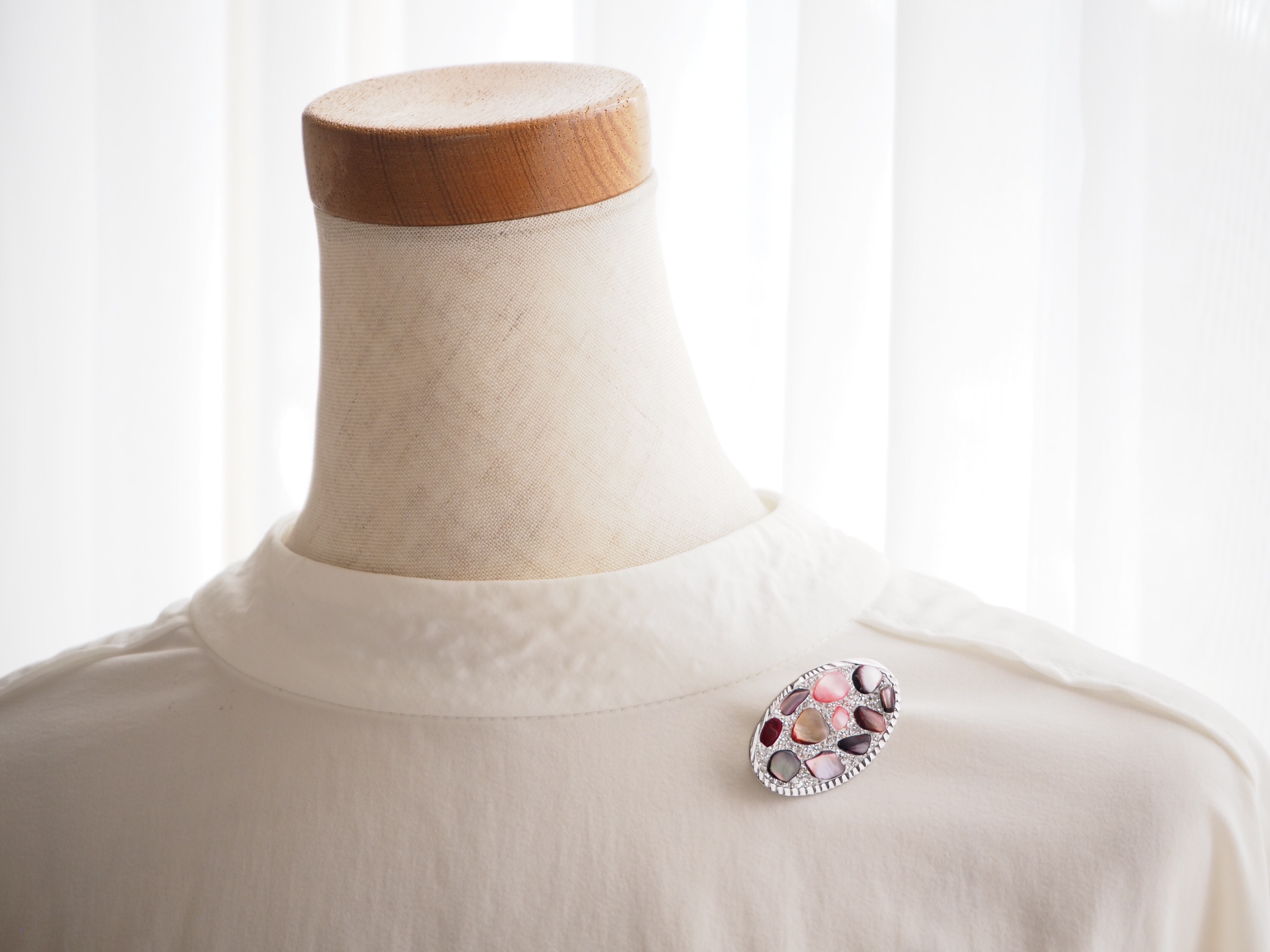 自然素材のシェルと極小のスワロフスキー®クリスタルを散りばめたオーバル型のブローチです。