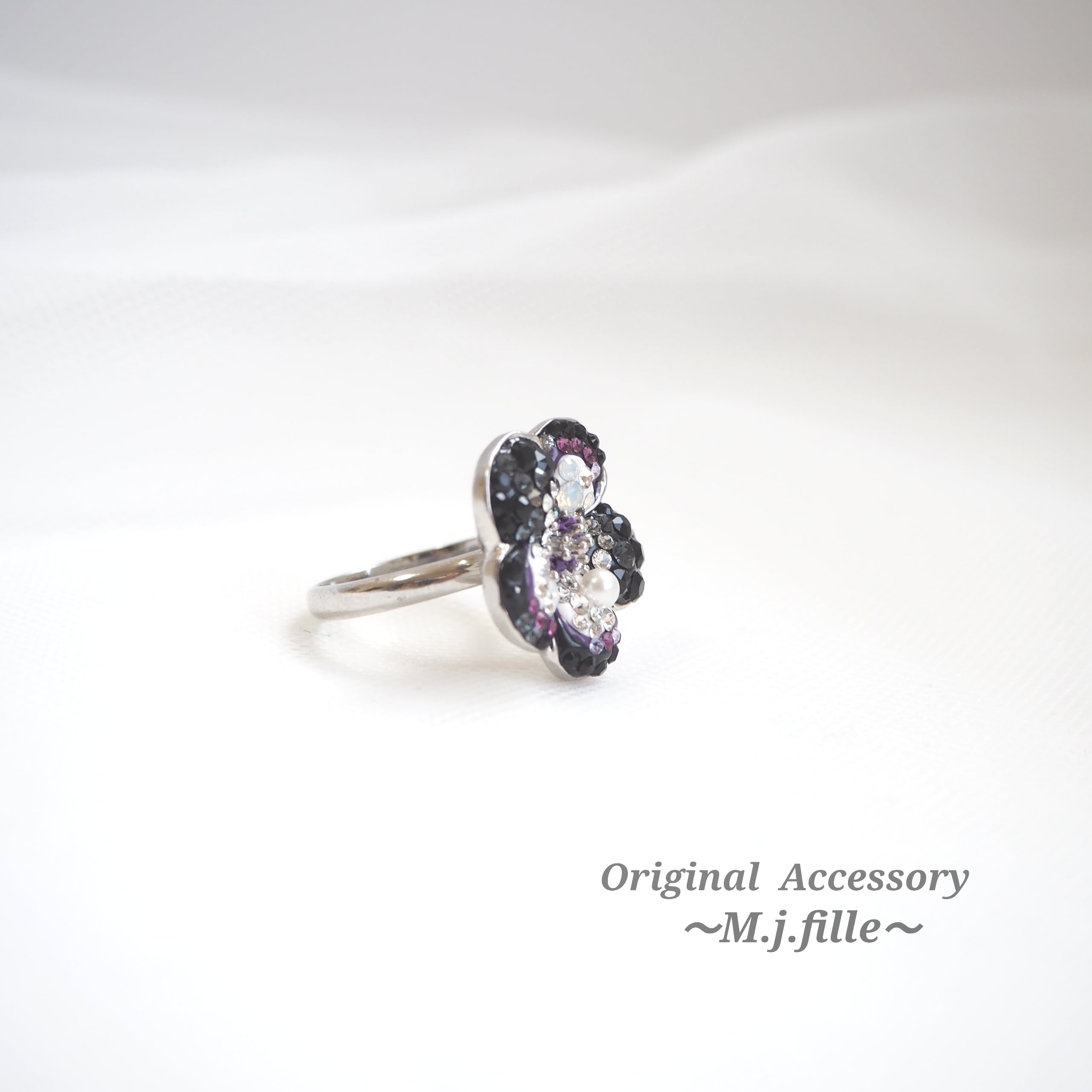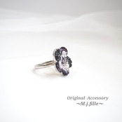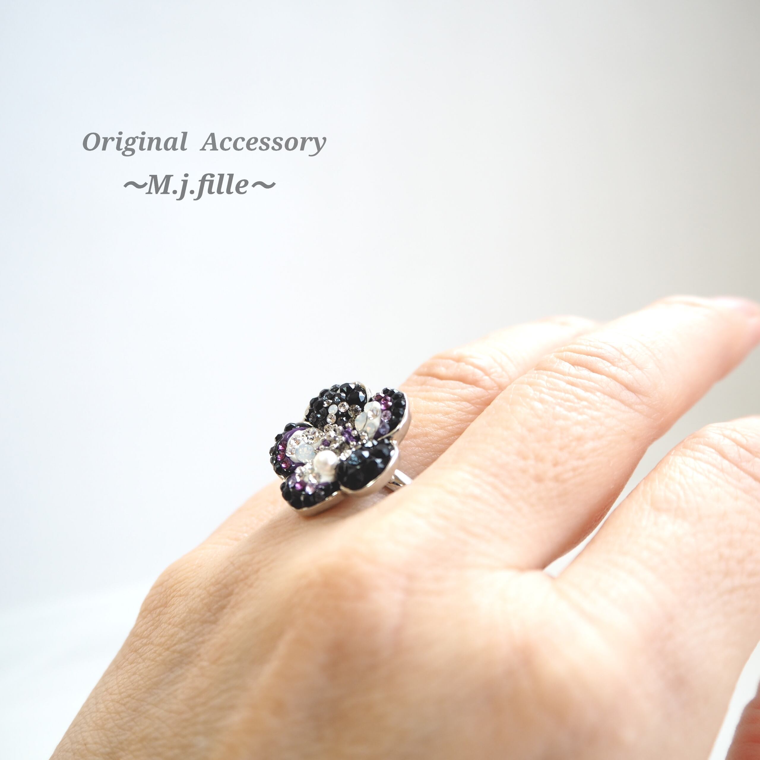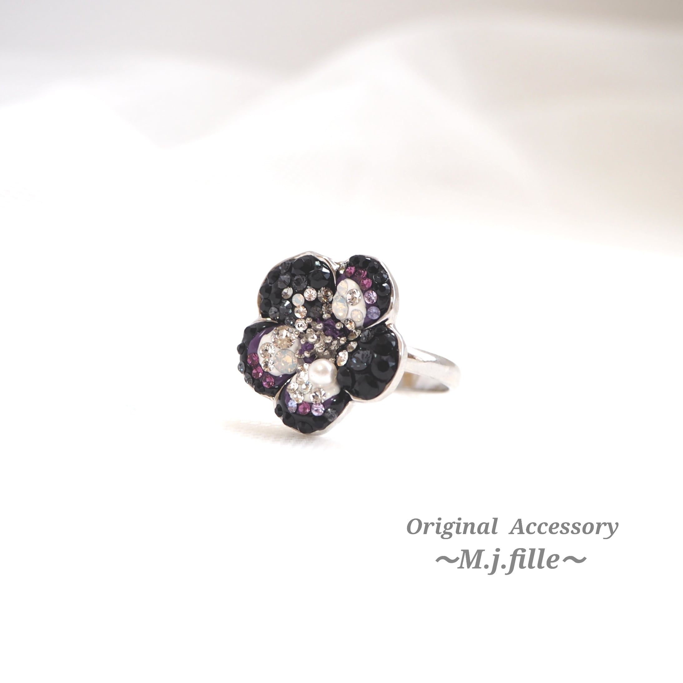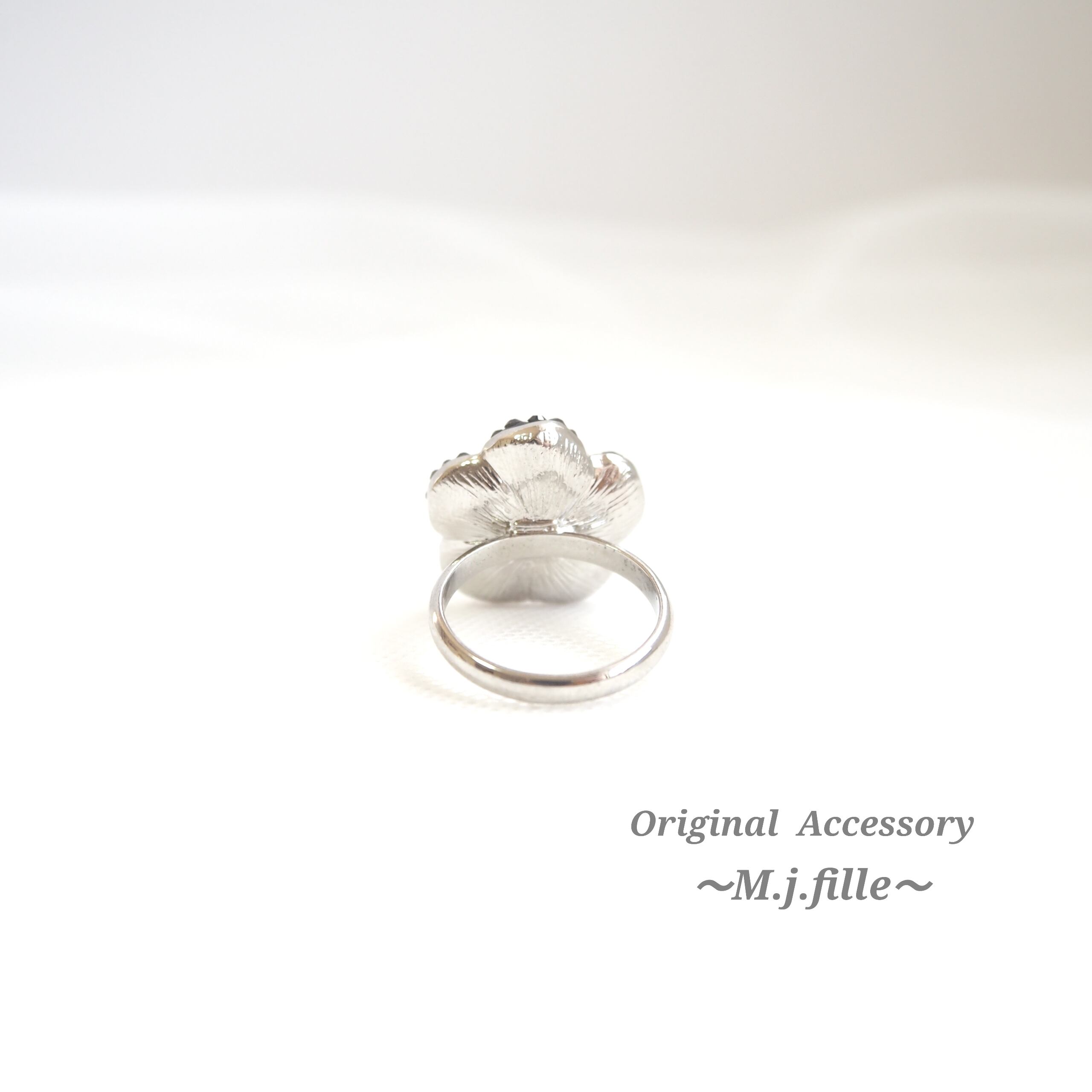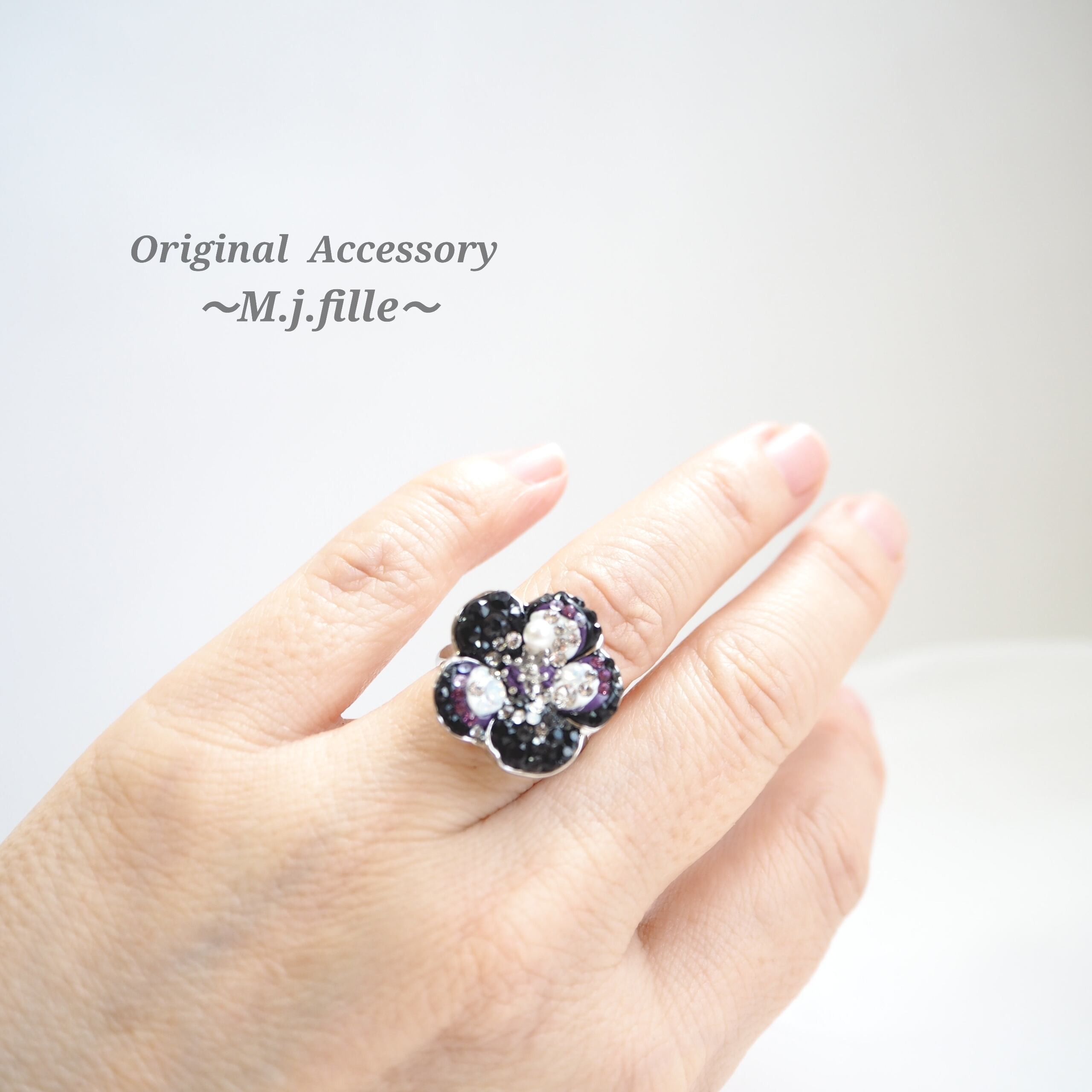 1粒のパールが上品さをプラス。大人の指に個性的で落ち着いた花を咲かせてくれます。アメジストで彩りを添えました。ブラックベースでクールな中に華やかさもあるリングです。
