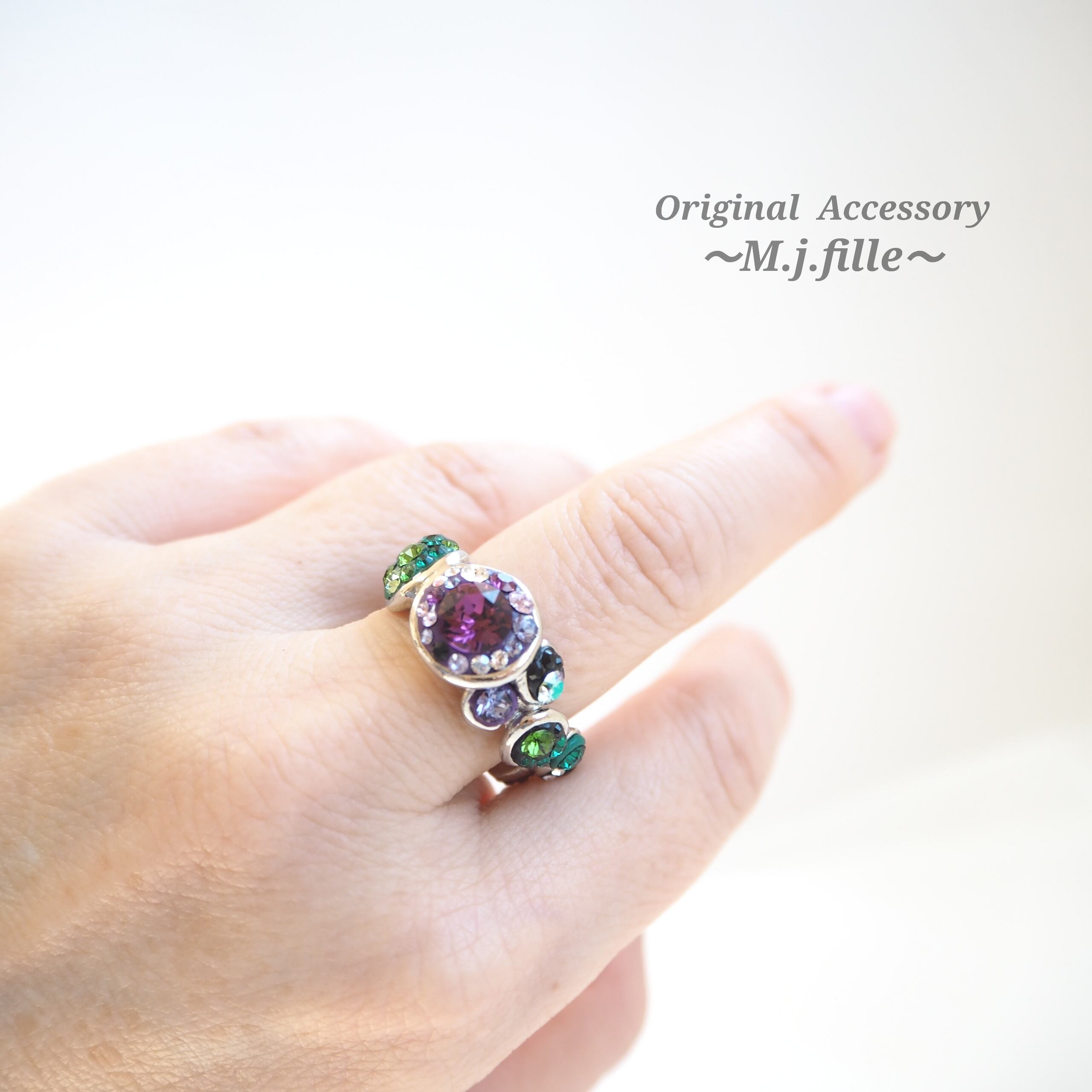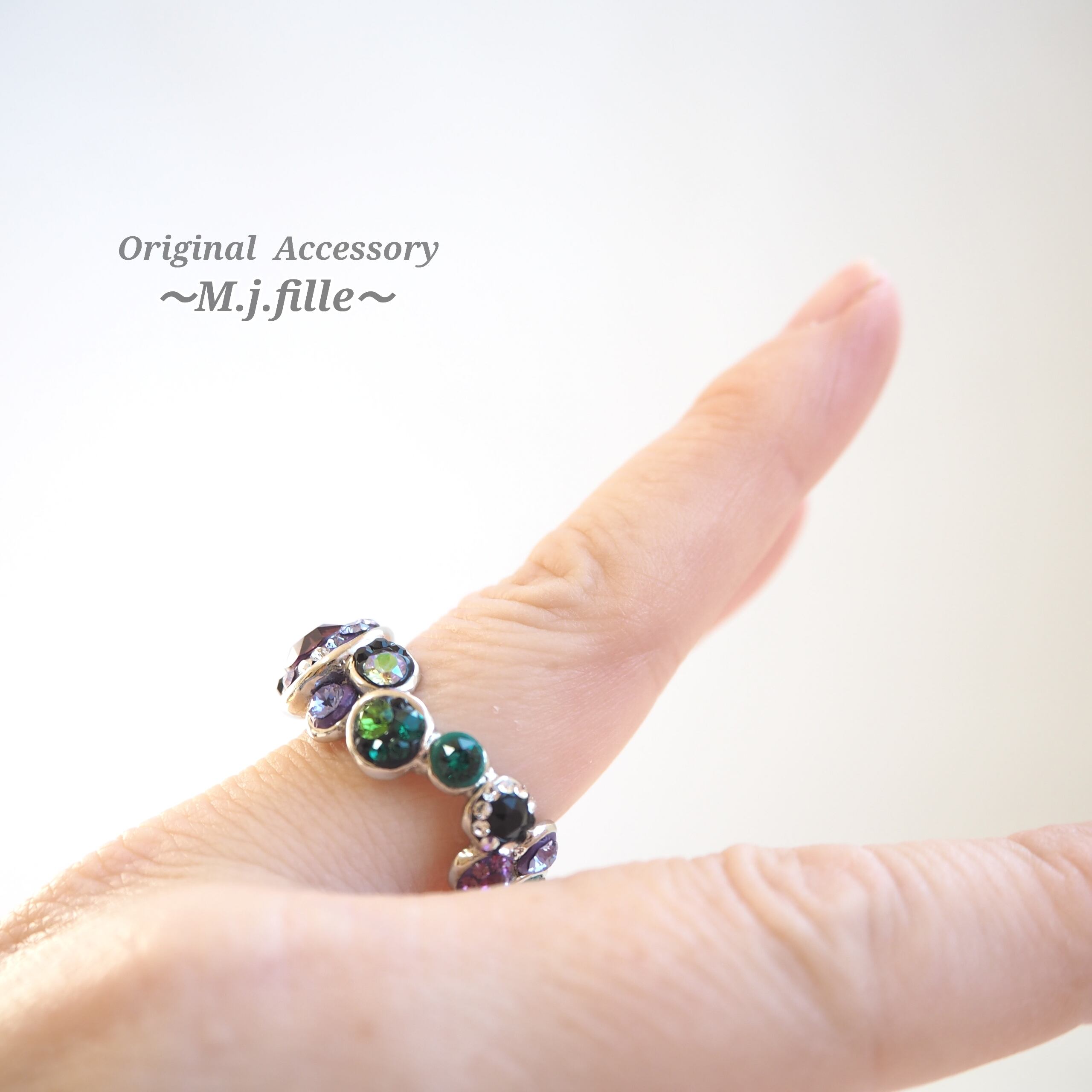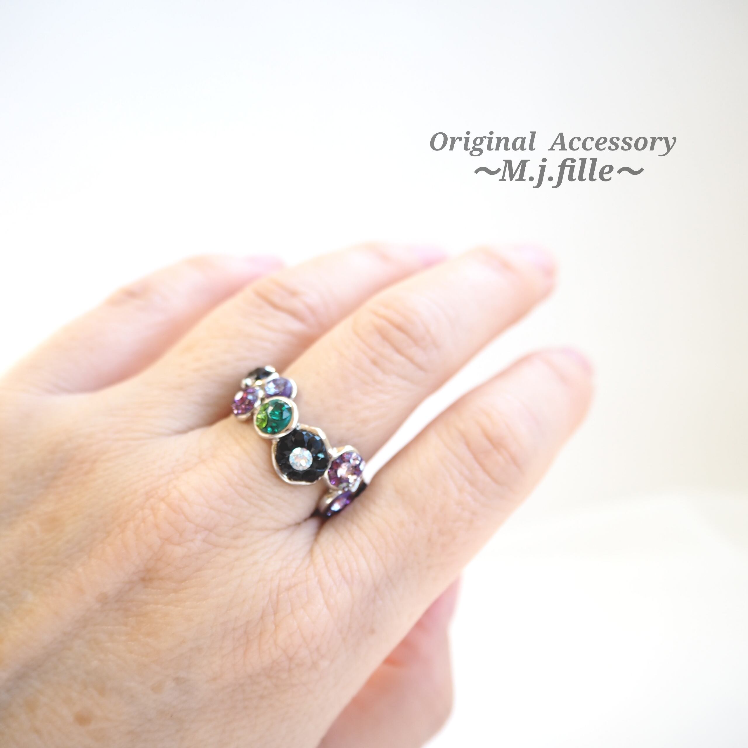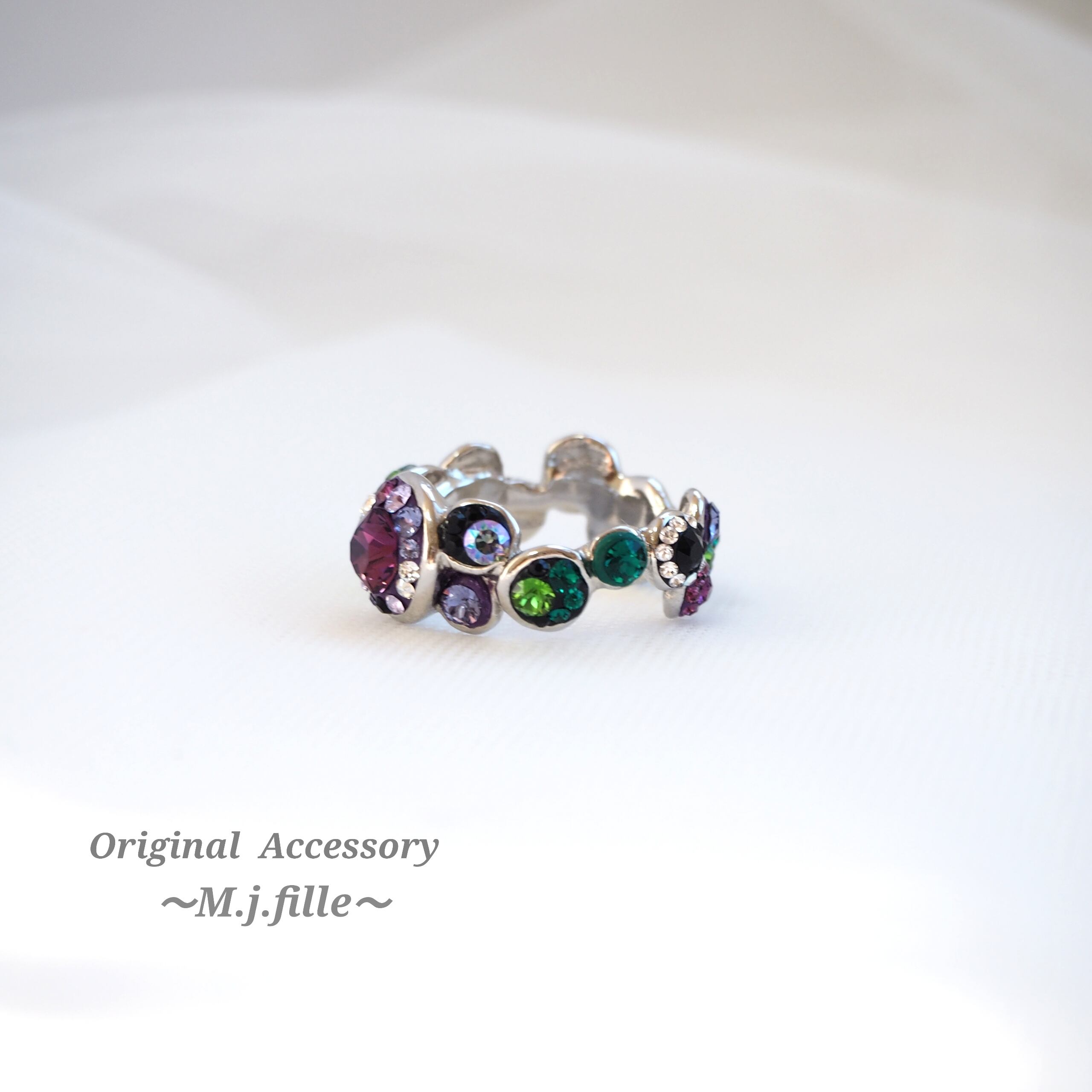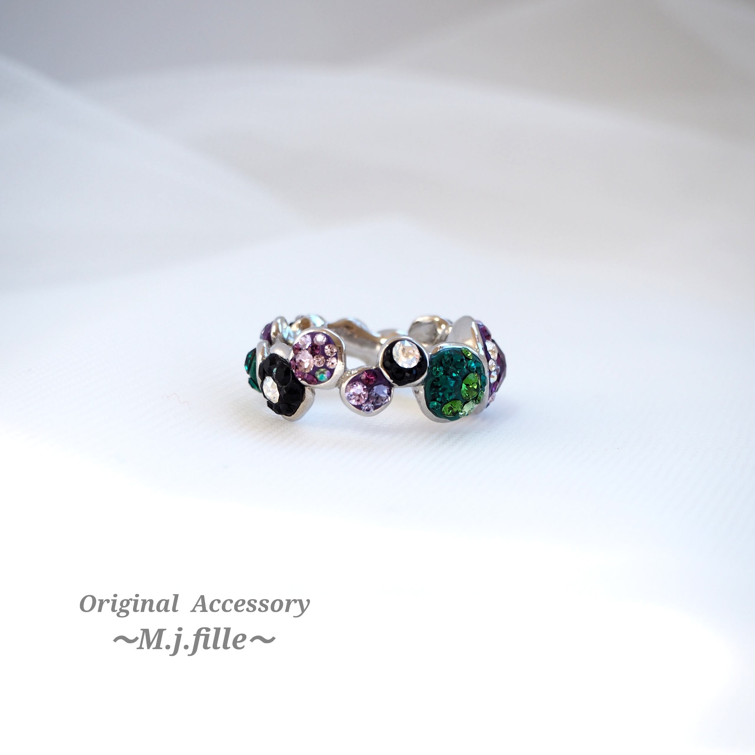 アメジスト系、グリーン系、ホワイト系、ブラック系のスワロフスキー®クリスタルを12色、サイズも5種類使用。全ての泡の色合わせやクリスタルの配置が異なります。贅沢でゴージャスな人目を惹くリング、シンプルなモノトーンの装いにも、これ一つで華やぎをプラスしてくれます。